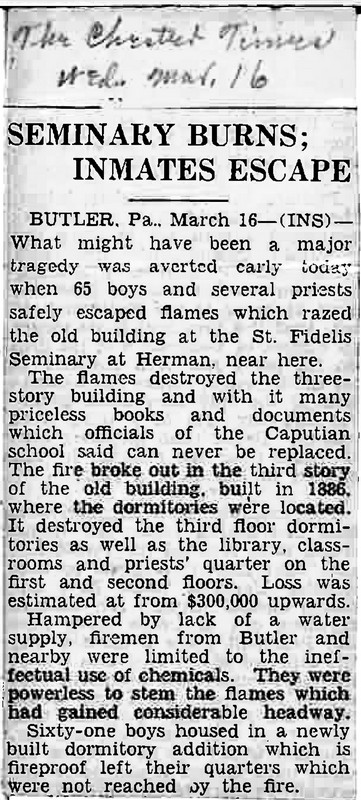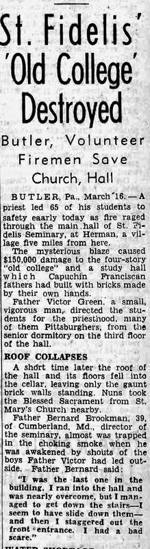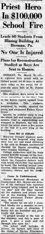 Father Bertrand Brookman of Cumberland, Md., 39 year-old director of the seminary who narrowly escaped being trapped, said he had “ no idea” how the blaze started. All the students and priests were out of the building before their shouts awakened Father Brookman. He recalled: